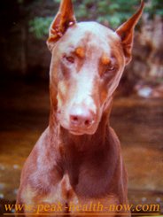 Even though he was getting two large meals per day, Erik's weight began to drop. His svelte, muscular Doberman build quickly became gaunt and bony. I began to get worried comments and strange looks from my 'dog friends.' However, skinny as he was, Erik's coat had taken on a sheen like polished lacquer. His body looked very clear and clean and he had more energy than before. The blood coming out in his urine diminished significantly. So I continued with his protocol.