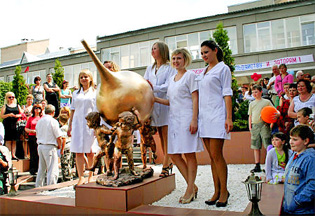 Nurses at the Mashuk Akva-Term spa in the Russian town of Zheleznovodsk pose with the newly unveiled enema monument on Wednesday June 18.